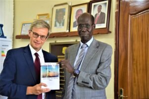 ممثلاً لـ ” ELTE” من قبل إدارة جامعة جوبا معربا عن امتنانه الشديدبهذه التكريما ، فيما كرم ايضا مدير جامعة جوبا البروفيسور جون أكيج ،لوثر جاشكي، نائب رئيس بعثة الاتحاد الأوروبي إلى جنوب السودان، نسخة من كتابه: جنوب السودان: الطريق الذي لم يُسلك.