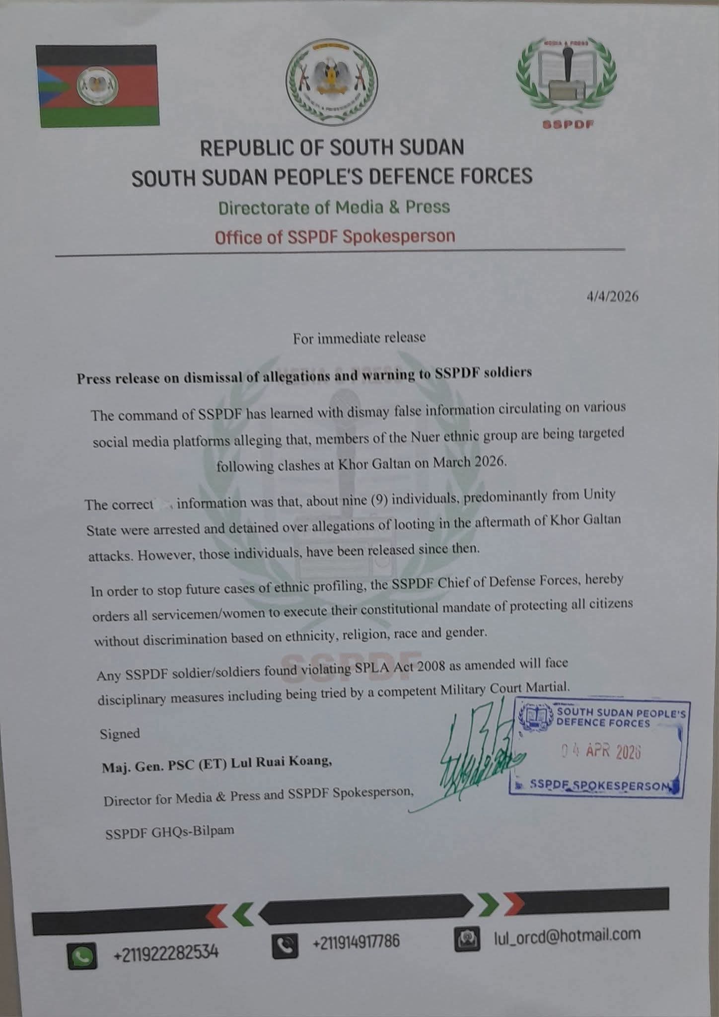نفت قوات دفاع شعب جنوب السودان صحة التقارير المتداولة بشأن استهداف أفراد من قبيلة النوير على خلفية أحداث خور غلطان في مارس 2026.