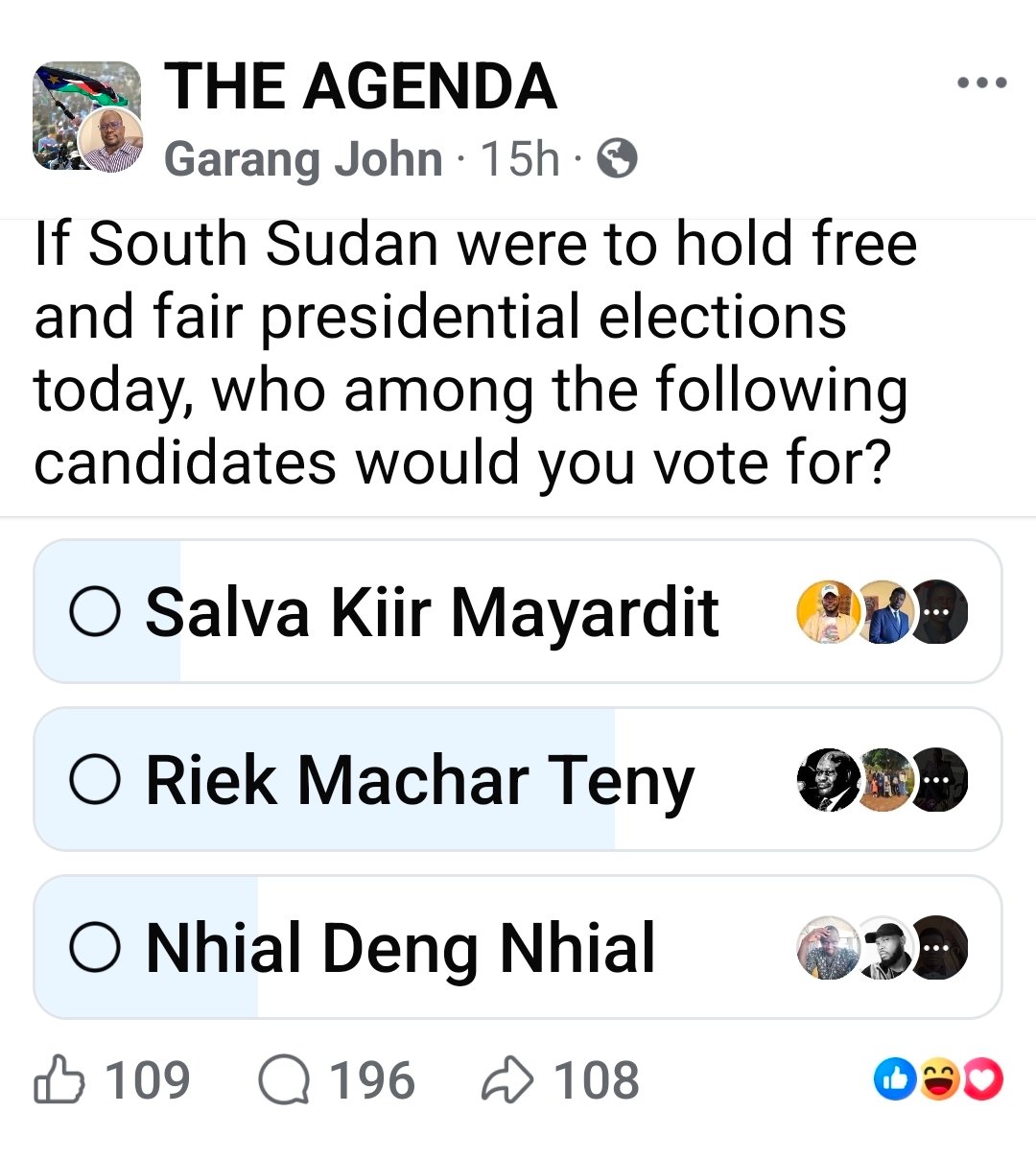 كشف استطلاع رأي افتراضي نشره الناشط “قرنق جون” على وسائل التواصل الاجتماعي في صحفة “The Agenda” على الفيسبوك عن نتيجة صادمة، حيث أظهر تقدمًا ملحوظًا لنائب الاول لرئيس الجمهوريه المعتقل الدكتور رياك مشار تينج في سباق الرئاسة افتراضية، رغم اعتقاله واحتجازه حاليًا في السجن.